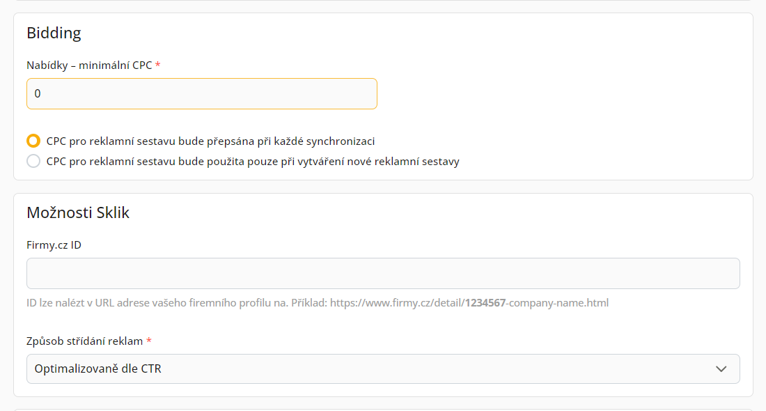 V sekci Sklik opět musíme zvolit účet, se kterým se má Conviu propojit. Následně vyplnit rozpočet, nabídku CPC a také můžeme kampaň propojit s Firmy.cz.
