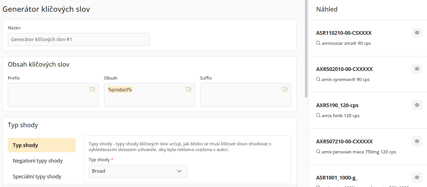 Po nastavení Sestav je potřeba nastavit generátor klíčových slov, což lze provést v sekci Klíčová slova. Zde zadáme proměnné ze kterých se mají klíčová slova tvořit, typy shod a další nastavení. V náhledu můžeme kontrolovat znění klíčových slov.