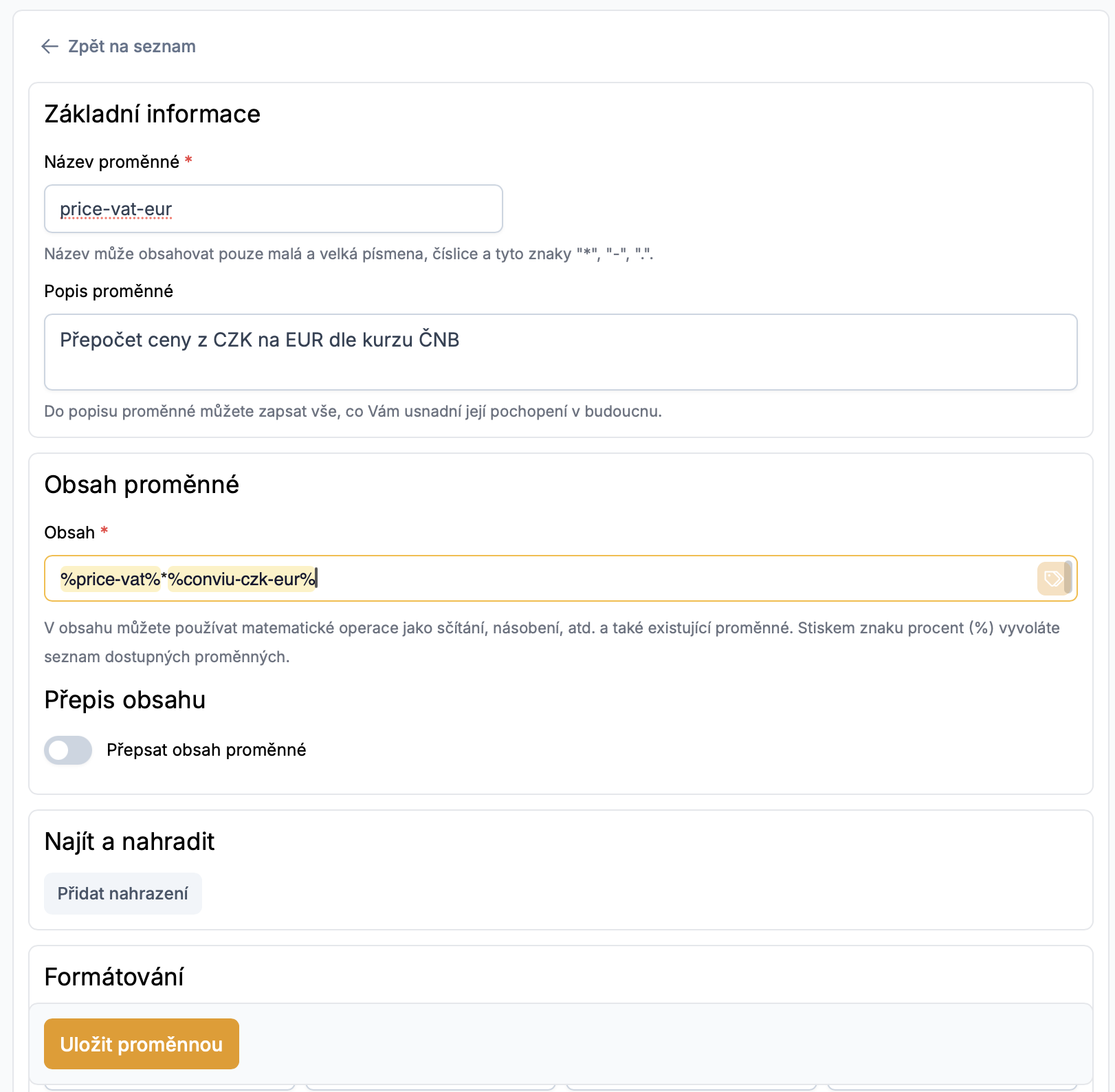 Jako poslední, do kolonky „*Obsah proměnné*“ vložíme následující vzorec.&#x20;