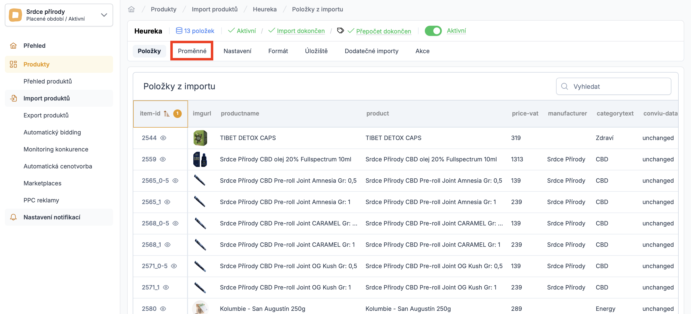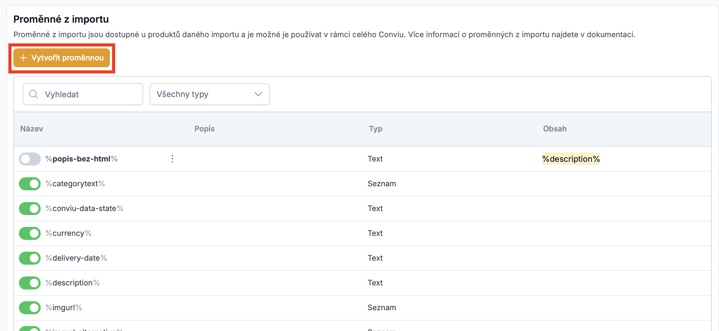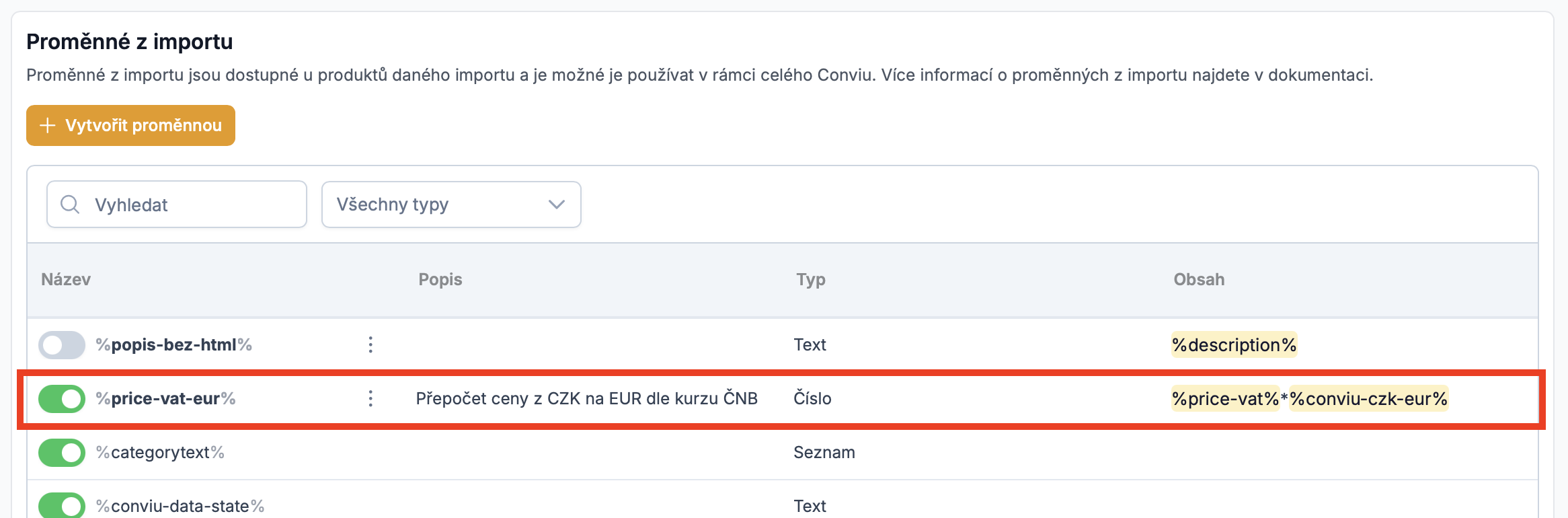 Novou proměnou pak najdete v přehledu všech proměnných na vybraném importu.
