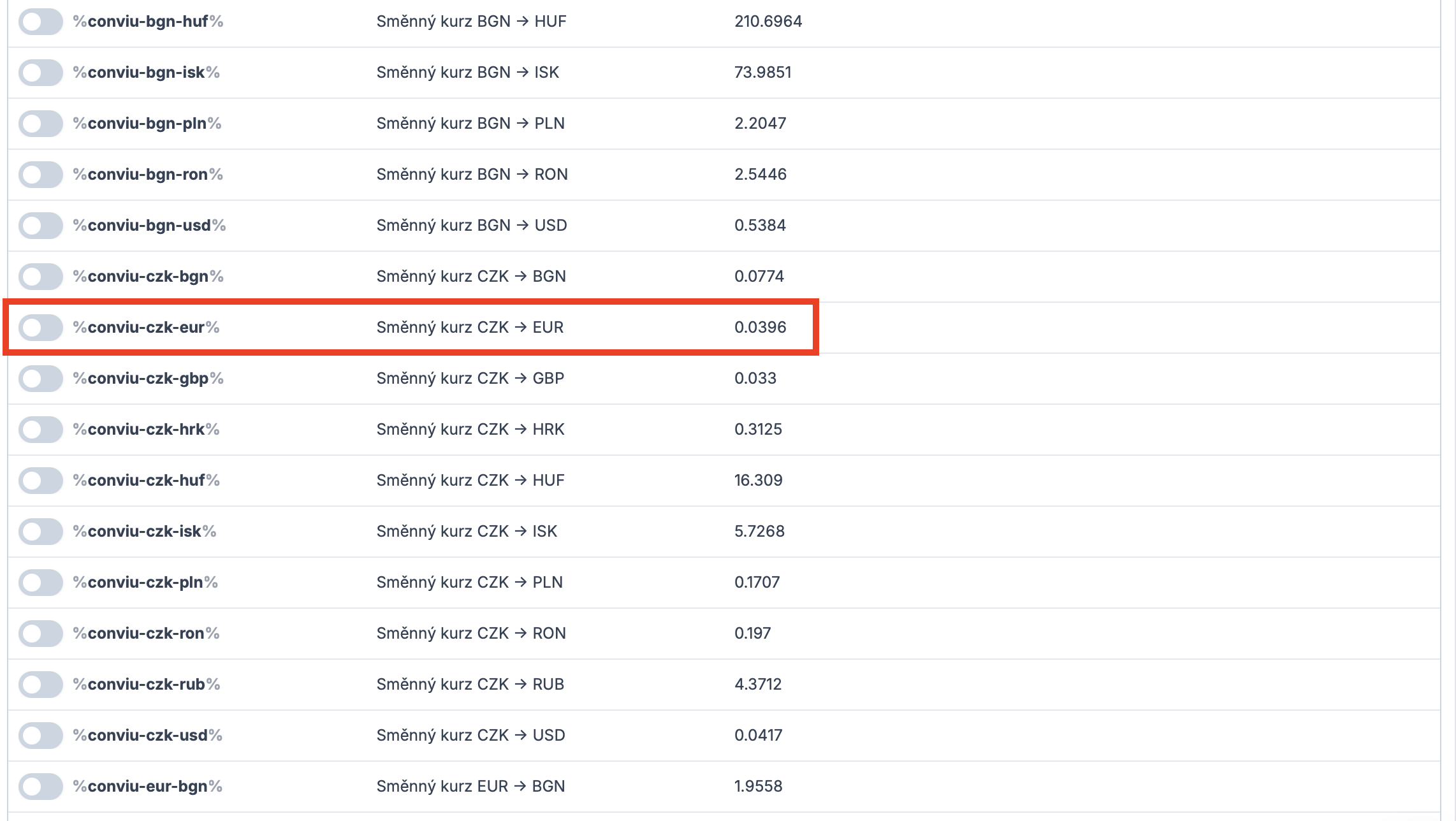 Tímto se vám zobrazí seznam proměnných, které můžete použít pro tvorbu přepisovacího pravidla, které upraví pevnou prodejní cenu ve vašem feedu na jinou měnu. V našem případě z CZK na EUR. Aktivujeme tedy proměnnou **%conviu-czk-eur%**.